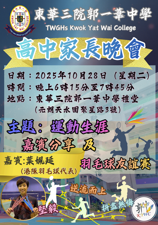 本校成功邀請「港隊羽毛球代表」星級運動員葉姵延小姐擔任講座主講嘉賓,藉此提升高中學生對生涯規劃的認識、體驗全國運動會的體育精神,並配合教育局及世界衛生組織倡議的「MVPA60」(每星期平均每天累積最少60分鐘中等至劇烈強度的體能活動),鼓勵同學建立恆常運動的習慣。當晚校方亦會向家長闡述學校發展政策及安排班主任會面時間。敬希 閣下踴躍支持和參與。活動詳情如下﹕