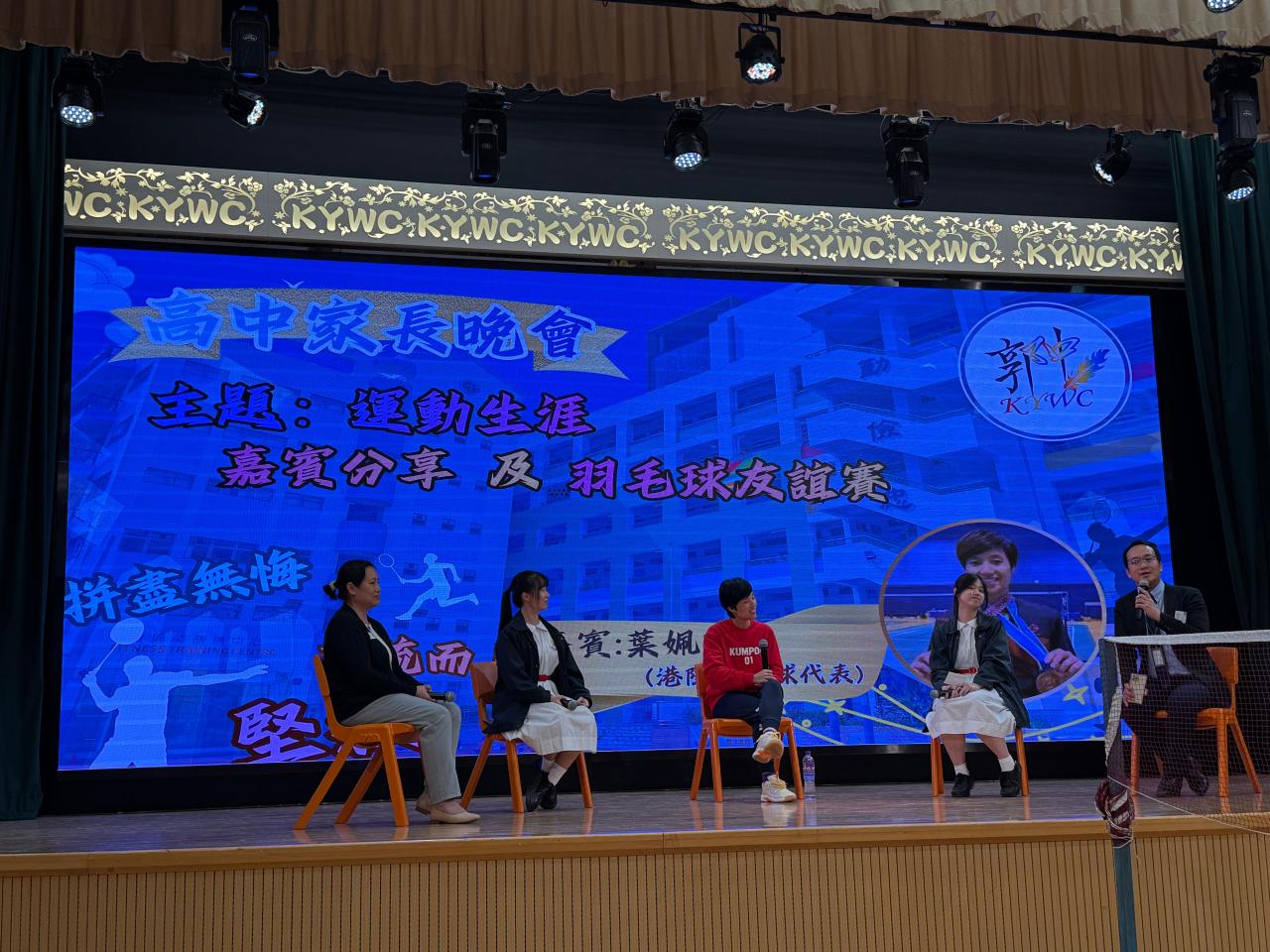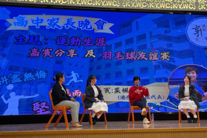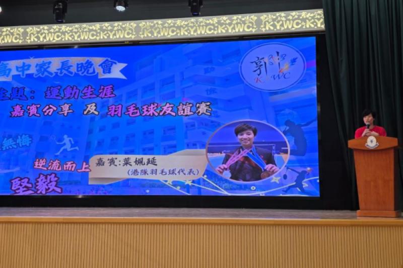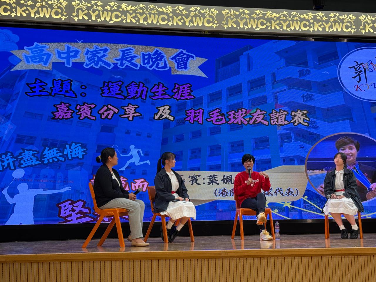 本校於 2025 年 10 月 28 日舉行「高中家長晚會」,感謝前香港羽毛球代表運動員葉姵延(黑妹)撥冗蒞臨擔任嘉賓。葉姵延曾於亞運會擊敗當時世界排名第一、奧運金牌得主張寧,憑藉堅毅不屈的精神,一次又一次創造奇蹟。她分享的心路歷程,深深激勵了在場的老師、家長和學生,學習如何面對困難與壓力。當晚更安排了與黑妹即場對戰的環節,場面既興奮又刺激,全場觀眾都十分投入。