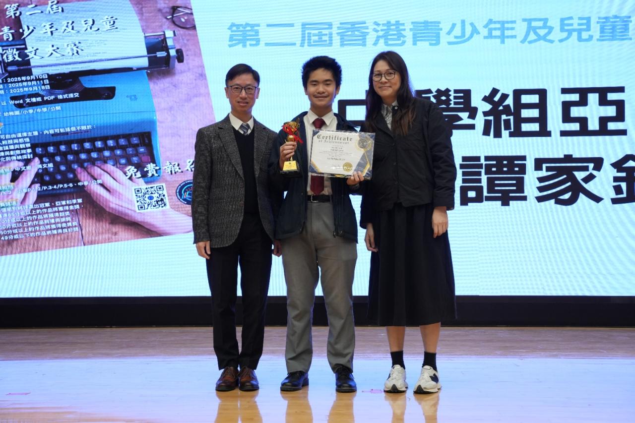 本校 5D 譚家釗同學榮獲香港青少年及兒童才藝表演協會主辦「第二屆香港青少年及兒童徵文大賽」中學組亞軍;陳俊強老師榮獲同項比賽的公開組冠軍及粵港澳大灣區文藝協會舉辦「第一屆粵港澳大灣區徵文比賽中文組 香港及澳門區」公開組季軍。