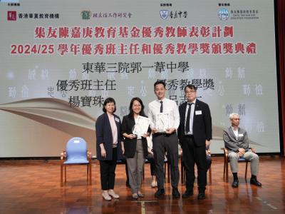 01/11/2025優秀教師獎勵計劃頒獎典禮熱烈祝賀本校楊寶珠老師及呂志仁老師分別榮獲2024/25學年集友陳嘉庚教育基金優秀班主任及優秀教學獎。